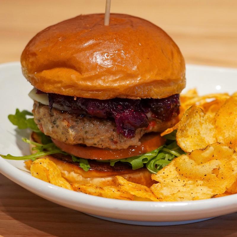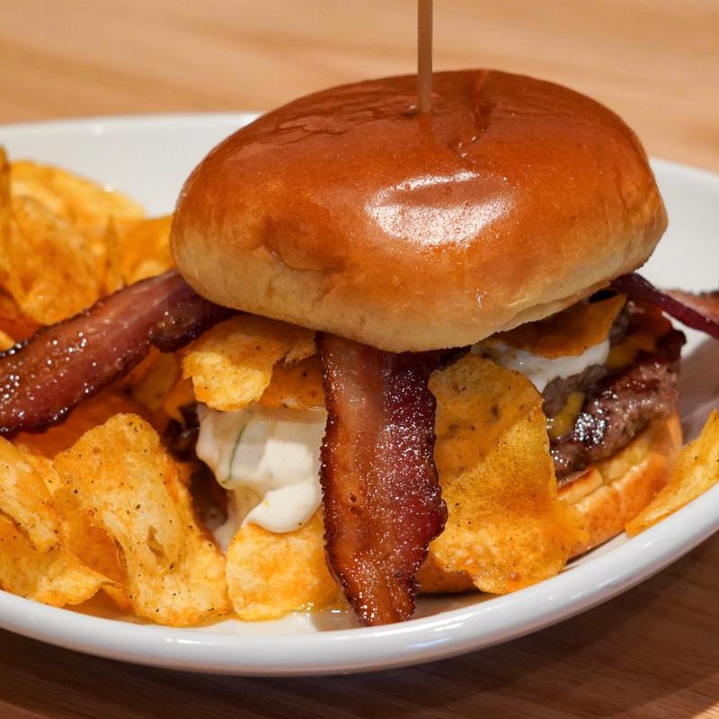 Served "Pink*" or "No Pink" with Chips or Coleslaw | Upgrade to Fries, Onion Rings, Tots, Truffle Fries, Sweet Potato Fries, Side Salad, Cup of Soup, Fresh Fruit, French Onion Soup, Gluten-Free Bread or Gluten-Free Bun