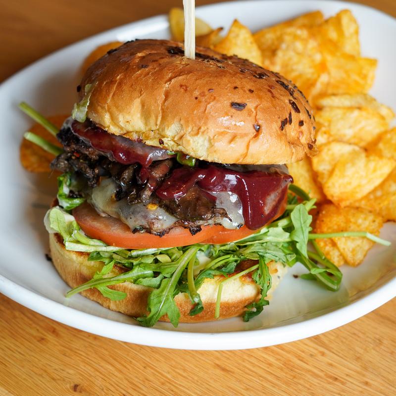 Served "Pink*" or "No Pink" with Chips or Coleslaw | Upgrade to Fries, Onion Rings, Tots, Truffle Fries, Sweet Potato Fries, Side Salad, Cup of Soup, Fresh Fruit, French Onion Soup